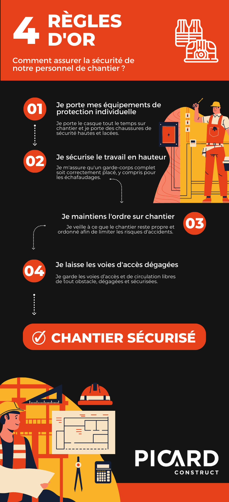 Chez Picard Construct, on ne plaisante pas avec la sécurité de nos équipes ! C’est pour cela que chaque membre de notre organisation est sensibilisé aux 4 règles d’or instaurées sur chantier :